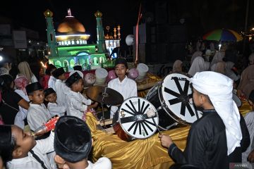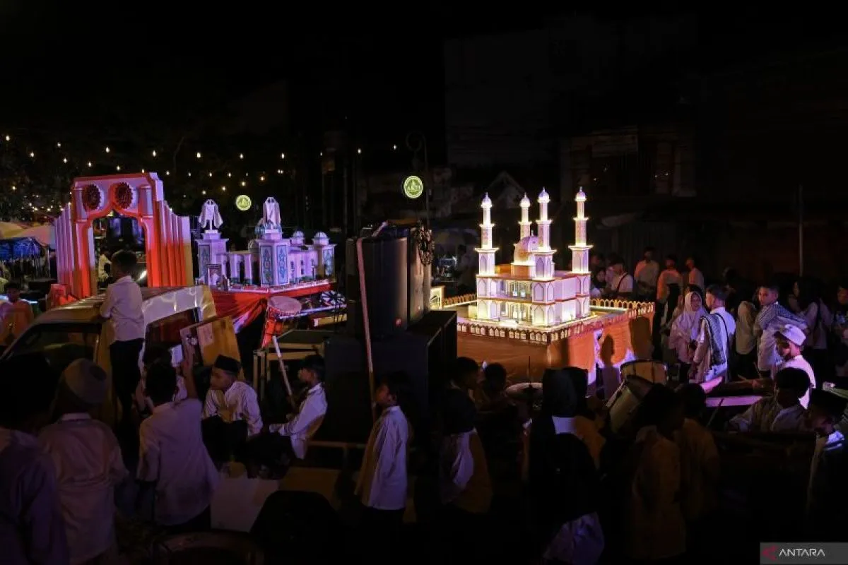 Anak-anak memukul drum saat takbir keliling di kawasan kota tua Ampenan, Mataram, NTB, Jumat (20/3/2026). Kegiatan tersebut diselenggarakan dalam rangka menyambut Hari Raya Idul Fitri 2026 yang jatuh pada hari Sabtu (21/3). ANTARA FOTO/Ahmad Subaidi/agr