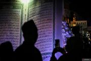 Siluet umat muslim berada dekat replika Al Quran saat takbir keliling di kawasan kota tua Ampenan, Mataram, NTB, Jumat (20/3/2026). Kegiatan tersebut diselenggarakan dalam rangka menyambut Hari Raya Idul Fitri 2026 yang jatuh pada hari Sabtu (21/3). ANTARA FOTO/Ahmad Subaidi/agr
