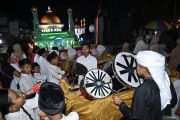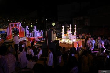 Umat muslim mengikuti kegiatan pawai takbir keliling di kawasan kota tua Ampenan, Mataram, NTB, Jumat (20/3/2026). Kegiatan tersebut diselenggarakan dalam rangka menyambut Hari Raya Idul Fitri 2026 yang jatuh pada hari Sabtu (21/3). ANTARA FOTO/Ahmad Subaidi/agr