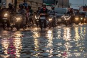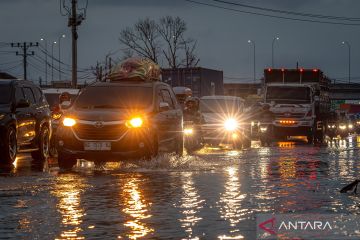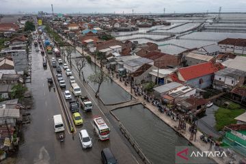 Kendaraan bermotor yang didominasi pemilir melaju perlahan di jalur pantai utara (Pantura) Semarang-Demak yang tergenang banjir rob (limpasan air laut ke daratan), Sayung, Kabupaten Demak, Jawa Tengah, Jumat (27/3/2026). Pada H+5 Lebaran hingga pukul 18.30 WIB, arus lalu lintas pemilir, baik lokal maupun antarprovinsi yang melintasi jalur pantura tersebut terpantau mengalami ketersendatan hingga sekitar empat kilometer akibat adanya banjir rob di sejumlah titik ruas jalan. ANTARA FOTO/Aji Styawan/wpa.