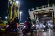 Pemilir kendaraan roda dua berjalan keluar dari geladak kapal setibanya di Pelabuhan Merak, Kota Cilegon, Banten, Sabtu (28/3/2026). PT ASDP Indonesia Ferry (Persero) memprediksi pada puncak arus balik libur Lebaran 2026 gelombang kedua terjadi pada 28-29 Maret dengan volume kendaraan pemilir yang menyeberang dari Pulau Sumatera menuju Pulau Jawa diperkirakan mencapai 25.000 hingga 27.000 unit. ANTARA FOTO/Muhammad Bagus Khoirunas/nz