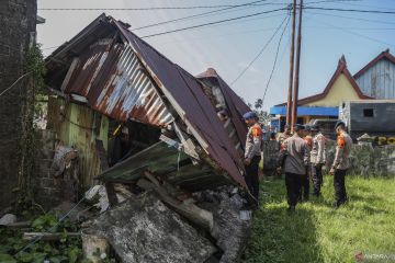 Sejumlah polisi mengamati rumah rusak terdampak gempa magnitudo 7,6 di Kelurahan Gambersi, Ternate, Maluku Utara, Kamis (2/4/2026). Gempa bumi yang terjadi pukul 06.48 WIT pada kedalaman 18 km di perairan Bitung, Sulawesi Utara dan Maluku Utara tersebut mengakibatkan bangunan rumah warga di Kelurahan Gambesi Ternate mengalami kerusakan ringan. ANTARA FOTO/Andri Saputra/foc.