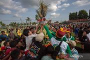 Warga berebut gunungan hasil pertanian saat kirab budaya di Desa Margokaton, Seyegan, Sleman, D.I Yogyakarta, Minggu (19/4/2026). Kirab budaya itu menampilkan berbagai potensi desa, salah satunya adalah sektor pertanian yang menjadi sumber kehidupan bagi sebagian besar warga di desa tersebut. ANTARA FOTO/Andreas Fitri Atmoko/agr