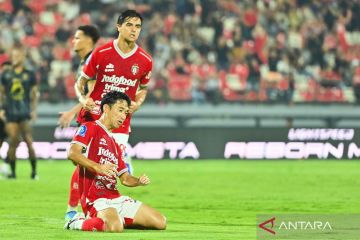 Pesepak bola Bali United Teppei Yachida (depan) berselebrasi usai mencetak gol ke gawang Malut United pada pertandingan Super League 2025/2026 di Stadion Kapten I Wayan Dipta, Gianyar, Bali, Minggu (19/4/2026). Bali United mengalahkan Malut United dengan skor 4-1. ANTARA FOTO/Fikri Yusuf/YU