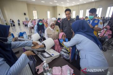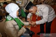 Petugas memeriksa kesehatan calon haji setibanya di Asrama Haji Indramayu, Jawa Barat, Selasa (21/4/2026). Sebanyak 441 jamaah calon haji dan empat orang petugas haji kelompok terbang (kloter) pertama embarkasi Kertajati yang berasal Kabupaten Indramayu masuk ke asrama untuk transit dan beristirahat sebelum diberangkatkan ke Arab Saudi melalui Bandara Kertajati. ANTARA FOTO/Dedi Suwidiantoro/nz