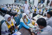 Petugas memeriksa kondisi kesehatan jamaah calon haji di Grand El-Hajj Asrama Haji Banten, Kota Tangerang, Banten, Selasa (21/4/2026). Asrama haji tersebut mulai beroperasi perdana tahun ini dengan melayani sebanyak 9.192 calon haji asal Provinsi Banten yang terbagi dalam 24 kelompok terbang (kloter) mulai 21 April hingga 18 Mei 2026. ANTARA FOTO/Putra M. Akbar/wsj.