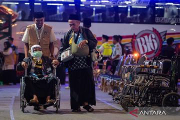 Petugas mendorong kursi roda seorang calon haji lansia menuju ruang aula di Grand El-Hajj Asrama Haji Banten, Kota Tangerang, Banten, Selasa (21/4/2026). Asrama haji tersebut mulai beroperasi perdana tahun ini dengan melayani sebanyak 9.192 calon haji asal Provinsi Banten yang terbagi dalam 24 kelompok terbang (kloter) mulai 21 April hingga 18 Mei 2026. ANTARA FOTO/Putra M. Akbar/wsj.