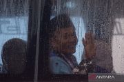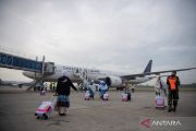 Calon haji kelompok terbang (kloter) pertama embarkasi Palembang (PLM 01) melambaikan tangan, di Bandara Internasional Sultan Mahmud Baddarudin (SMB) II Palembang, Sumatera Selatan, Rabu (22/4/2026). Sebanyak 443 jamaah calon haji asal Kabupaten Ogan Komering Ulu (OKU) Timur diberangkatkan ke Arab Saudi untuk menunaikan ibadah haji. ANTARA FOTO/Nova Wahyudi/wsj.