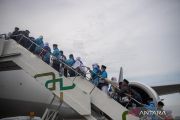 Jamaah calon haji kelompok terbang (kloter) pertama embarkasi Palembang (PLM 01) berjalan menuju pesawat yang akan membawa mereka menuju tanah suci, di Bandara Internasional Sultan Mahmud Baddarudin (SMB) II Palembang, Sumatera Selatan, Rabu (22/4/2026). Sebanyak 443 jamaah calon haji asal Kabupaten Ogan Komering Ulu (OKU) Timur diberangkatkan ke Arab Saudi untuk menunaikan ibadah haji. ANTARA FOTO/Nova Wahyudi/wsj.