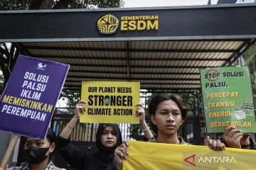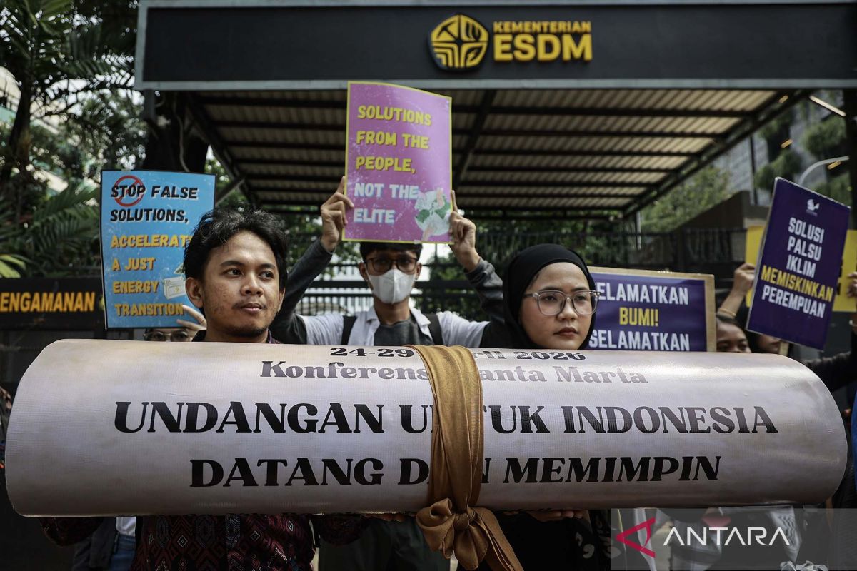 Massa yang tergabung dalam koalisi masyarakat sipil berunjuk rasa di depan kantor Kementerian Energi dan Sumber Daya Mineral (ESDM), Jakarta, Rabu (22/4/2026). Mereka mendesak pemerintah mengambil peran kepemimpinan di forum global serta menunjukkan komitmen bertransisi secara adil dari energi fosil dengan secara aktif menghadiri dan terlibat dalam konferensi Transitioning Away from Fossil Fuels (TAFF) yang berlangsung di Santa Marta, Kolombia, pada 24-29 April 2026. ANTARA FOTO/Dhemas Reviyanto/wsj.