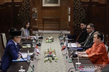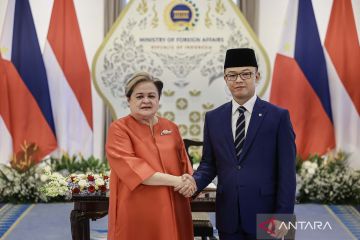 Menteri Luar Negeri Sugiono (kanan) berjabat tangan dengan Menteri Luar Negeri Filipina Theresa P. Lazaro (kiri) saat pertemuan ke-8 Joint Commission for Bilateral Cooperation (JCBC) Indonesia-Filipina di Gedung Pancasila, Kementerian Luar Negeri, Jakarta, Kamis (23/4/2026). Pertemuan tersebut membahas penguatan kerja sama kedua negara, mulai dari sektor ekonomi hingga isu geopolitik global. ANTARA FOTO/Dhemas Reviyanto/wsj.