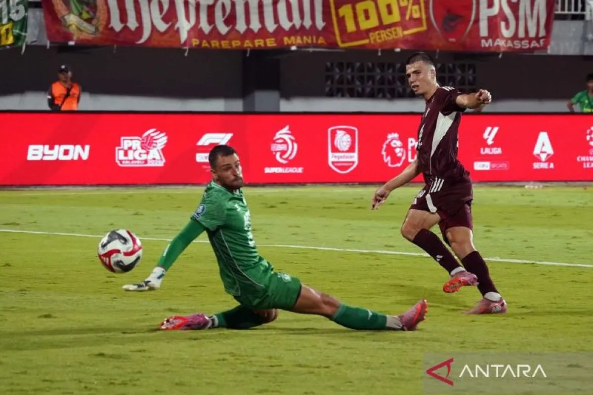 Pesepak bola PSM Makassar Luka Cumic (kanan) menendang bola ke arah dalam gawang Persik Kediri yang dijaga Leonardo Navacchio pada pertandingan BRI Super League 2025/2026 di Stadion BJ Habibie, Parepare, Sulawesi Selatan, Kamis (23/4/2026). PSM Makassar hantam Persik Kediri 3-1. ANTARA FOTO/Hasrul Said/wsj.