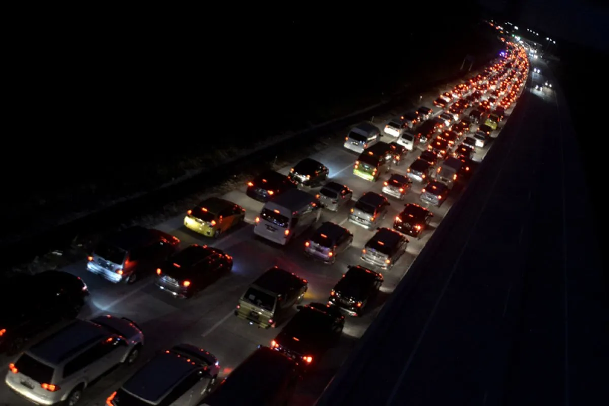 Sejumlah kendaraan pemudik arus balik terjebak kemacetan di kawasan Gerbang Tol Wilangan, Madiun, Jawa Timur, Selasa (19/6/2018). Puncak arus balik pemudik di ruas jalan tol Ngawi-Wilangan tersebut diperkirakan terjadi pada 19-20 Juni 2018. (ANTARA FOTO/Fikri Yusuf)