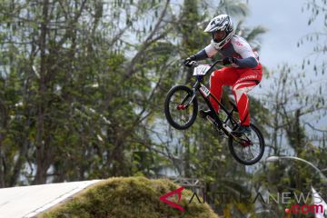 Atlet sepeda BMX Indonesia National Team putra I Gusti Bagus Saputra memacu sepedanya pada final men elite round kedua pada kejuaraan BMX Banyuwangi Internasional 2018 di Sirkuit Muncar, Banyuwangi, Jawa Timur, Minggu (15/7/2018). Pada final men elite round kedua kejuaraan tersebut diraih oleh atlet sepeda Indonesia National Team putra I Gusti Bagus Saputra, kemudian posisi kedua diraih GGMM Yesmart Swalayan Thrill BMX ISSI Kendal M Khabibur Rohman dan posisi ketiga atlet sepeda BMX Australia Kyle Green. (ANTARA FOTO/Zabur Karuru)