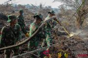 Petugas TNI berusaha memadamkan kebakaran lahan gambut yang terjadi di Kecamatan Kubu Babusalam, Kabupaten Rokan Hilir, Riau, Jumat (17/8/2018). Satgas Karhutla Riau terus melakukan upaya pemadaman dari darat dan udara agar kebakaran lahan gambut tidak semakin meluas. (ANTARA FOTO/Rony Muharrman)