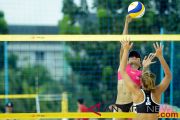 Pevoli pantai wanita Kazakhstan Alina Racheno mengembalikan bola kearah pevoli pantai wanita Indonesia pada pertandingan babak penyisihan voli pantai wanita Asian Games 2018 di arena voli pantai Jakabaring Sport City, Palembang, Sumsel, Indonesia, Minggu (19/8/2018). (ANTARA FOTO/INASGOC/Muhammad Adimaja)