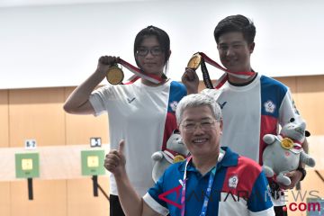 Penembak Chinese Taipei, Yingshin Lin (kiri) dan Shaocuan Lu (kanan) berfoto bersama President Chinese Taipei Shooting Assosiation, Steven S.K. Chen (tengah) usai menerima medali nomor beregu campuran 10 meter Air Rifle Asian Games 2018 di arena menembak Jakabaring Sport City (JSC) Palembang, Sumatera Selatan, Minggu (19/8/2018). Regu dari Chinese Taipei berhasil merebut medali emas, disusul Cina perak dan India perunggu. (ANTARA FOTO/INASGOC/Sutanta Aditya)