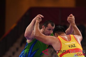 Pegulat Kazakhstan, Nurmakhan Tinaliyev (kanan) versus pegulat Uzbekistan, Muminjon Abdullaev (kiri) di final perebutan medali Emas Greco-Roman 130 kg Putra Asian Games ke-18 Tahun 2018 di JCC Assembly Hall, Jakarta Pusat, Rabu (22/8/2018). (ANTARA FOTO/INASGOC/IKHWAN YANUAR)