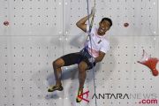 Atlet panjat tebing Indonesia, Yulianta Abu Dzar melakukan selebrasi setelah menjadi pemenang pada final speed relay putra Asian Games 2018 di Arena Panjat Tebing Jakabaring, Palembang, Sumatera Selatan, Senin (27/8/2018). (ANTARA FOTO/INASGOC/Rahmad Suryadi)