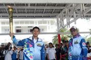 Gubernur Sulsel Nurdin Abdullah (kanan) bersama Ketua Panitia Pelaksana Asian Para Games (Inapgoc) Raja Sapta Oktohari (kiri) dan atlet lempar lembing Bahar Rahman (tengah) membawa obor saat Pawai Obor Asian Para Games di Makassar, Sulawesi Selatan, Rabu (12/9/2018). Asian Para Games 2018 akan berlangsung 6-13 Oktober 2018 di Jakarta dan Palembang. ANTARA FOTO/Yusran Uccang/pras.