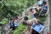 Anggota teater Lentera Universitas Djuanda Bogor melakukan aksi teatrikal dalam Bebersih Bogor di Taman Ekspresi, Kota Bogor, Jawa Barat, Sabtu (15/9/2018). Aksi Bebersih Bogor dalam rangka World Cleanup Day 2018 yang dilakukan serentak di 150 negara di dunia dan 34 provinsi di Indonesia tersebut untuk mengedukasi dan mengubah pola pikir serta prilaku masyarakat untuk tidak membuang sampah sembarang tempat. ANTARA FOTO/Arif Firmansyah/foc.