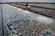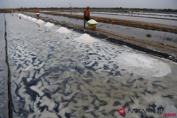 Buruh mengangkut hasil panen garam di Benowo, Surabaya, Jawa Timur, Jumat (21/9/2018). Realisasi perluasan ladang garam baru mencapai sekitar 4.000 hektare dari target pengupayaan 10.000 hektare untuk mendukung swasembada garam konsumsi pada 2019. ANTARA FOTO/Zabur Karuru/kye
