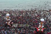 Dua Tabuik siap dibuang ke laut saat puncak Pesona Budaya Hoyak Tabuik, di Pantai Pariaman, Sumatera Barat, Minggu (23/9/2018). Ribuan orang menyaksikan puncak festival tahunan itu untuk memperingati Hari Asyura (10 Muharram) 1440 Hijriyah. ANTARA FOTO/Iggoy el Fitra/foc.
