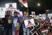 Suporter tim Arema FC membawa spanduk saat Ikrar Damai Sepak Bola Indonesia di Stadion Kanjuruhan, Malang, Jawa Timur, Sabtu (29/9/2018). Ikrar damai tersebut diharapkan mampu menciptakan suasana kondusif dalam kancah sepak bola nasional. ANTARA FOTO/Ari Bowo Sucipto/wsj.