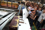 Ketua Komisi Pemilihan Umum (KPU) Arief Budiman (ketiga kanan) mengamati proses percetakan kotak dan bilik suara saat moninjau produksi perdana kedua perlengkapan Pemilu 2019 tersebut, di Gresik, Jawa Timur, Minggu (30/9/2018). Jumlah kotak suara yang diproduksi secara keseluruhan mencapai sedikitnya 4 juta sedangkan bilik suara 2 juta. ANTARA FOTO/Zabur Karuru/pras.