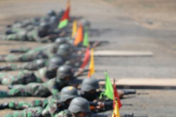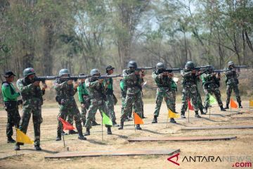 Sejumlah prajurit Korps Marinir menembak sasaran dengan menggunakan senapan serbu-1 (SS-1) ketika mengikuti lomba pembinaan satuan (binsat) di Lapangan Tembak Bhumi Marinir Karangpilang, Surabaya, Jawa Timur, Senin (8/10/2018). Lomba Binsat Korps Marinir yang diikuti 1326 prajurit dari 34 tim perwakilan Batalion Marinir se-Indonesia tersebut mempertandingkan lima kemampuan pokok prajurit Marinir. ANTARA FOTO/M Risyal Hidayat/aww.