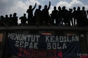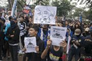 Sejumlah Bobotoh atau pendukung Persib Bandung melakukan aksi unjuk rasa di depan Gedung Sate, Bandung, Jawa Barat, Sabtu (13/10/2018). Mereka memprotes kebijakan PSSI dalam memberi hukuman dan sanksi atas pendukung dan tim Persib karena dianggap tidak adil serta menuntut adanya revolusi dan reformasi di kepengurusan PSSI saat ini. ANTARA FOTO/Novrian Arbi/aww.