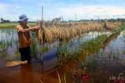Petani menjemur padi yang terendam banjir di area persawahan Desa Blang Leuah, Kecamatan Samatiga, Aceh Barat, Aceh, Sabtu (13/10/2018). Banjir akibat tingginya intensitas hujan yang terjadi sejak sepekan terakhir mengakibatkan 39 hektare tanaman padi siap panen terendam dan sebagian besar tanaman padi sudah mulai rusak. ANTARA FOTO/Syifa Yulinnas/aww.