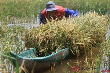 Petani membawa padi yang terendam banjir dengan menggunakan perahu di area persawahan Desa Blang Leuah, Kecamatan Samatiga, Aceh Barat, Aceh, Sabtu (13/10/2018). Banjir akibat tingginya intensitas hujan yang terjadi sejak sepekan terakhir mengakibatkan 39 hektare tanaman padi siap panen terendam dan sebagian besar tanaman padi sudah mulai rusak. ANTARA FOTO/Syifa Yulinnas/aww.