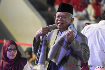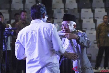 Calon Wakil Presiden nomor urut 01 Ma'ruf Amin bersiap menyerahkan sorbannya yang terjual Rp125 juta kepada pembeli pada lelang saat acara Konser Nasyid dan Sholawat untuk Kerukunan Bangsa di Istora Senayan, Jakarta, Sabtu (20/10/2018). Konser amal tersebut digelar untuk menggalang dana yang akan disumbangkan kepada korban bencana alam di NTB dan Sulawesi Tengah. ANTARA FOTO/Hafidz Mubarak A/wsj.