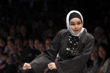 Model memperagakan busana rancangan Dian Pelangi dalam perhelatan Jakarta Fashion Week 2019 di Senayan City, Jakarta, Sabtu (20/10/2018). Gelaran pekan mode Jakarta Fashion Week (JFW) 2019 kembali digelar yang diikuti ratusan desainer tanah air dan mancanegara yang berlangsung hingga 26 Oktober. ANTARA FOTO/Hafidz Mubarak A/foc.