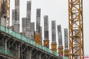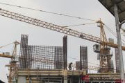 Pekerja menyelesaikan pembangunan rumah susun uang muka 0 Rupiah di Pondok Kelapa, Jakarta, Kamis (25/10/2018). Pembangunan rusun tersebut ditargetkan masuk tahap topping off pada Januari 2019 dan selesai Juli 2019. ANTARA FOTO/Dhemas Reviyanto/pras.