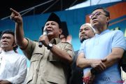 Calon Presiden nomor urut 2 Prabowo Subianto (tengah) berbicara disaksikan Musisi Dangdut Rhoma Irama (kiri) Ketua MPR Zulkifli Hasan (kanani) saat Deklarasi Relawan Rhoma Irama untuk Prabowo - Sandi, di Soneta Record Jalan Tole Iskandar Sukmajaya Depok, Jawa Barat, Minggu (28/10/2018). Deklarasi tersebut dihadiri relawan Rhoma Irama seluruh Indonesia .ANTARA FOTO/kahfie kamaru/ama.