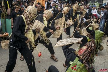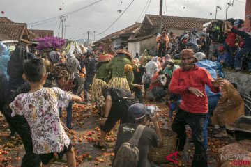 Warga saling melempar tomat busuk saat Helaran Perang Tomat di Cikareumbi, Kabupaten Bandung Barat, Jawa Barat, Minggu (28/10/2018). Sedikitnya dua ton tomat busuk digunakan untuk saling lempar sebagai ungkapan membuang sial dari segala macam hal buruk bagi masyarakat khususnya para petani saat musim tanam dan panen. ANTARA FOTO/Novrian Arbi/ama.