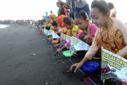 Anak-Anak menggunakan pakaian adat berbagai daerah di Indonesia saat melepasliarkan tukik di Pantai Boom, banyuwangi, jawa Timur, Minggu (28/10/2018). Hari Sumpah Pemuda di Banyuwangi diperingati dengan pelepasliaran 365 ekor tukik oleh anak-anak, untuk menumbuhkan kepedulian pelestarian Penyu. ANTARA FOTO/Budi Candra Setya/ama.