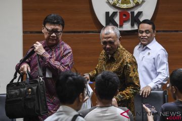 Ketua KPK Agus Rahardjo (tengah) bersama Mendagri Tjahjo Kumolo (kiri) dan Menpan-RB Syafruddin (kanan) meninggalkan ruangan seusai menyampaikan keterangan kepada wartawan terkait pengawasan internal pemerintah di gedung KPK, Jakarta, Jumat (9/11/2018). KPK mengundang Menteri Dalam Negeri dan Menteri Pendayagunaan Aparatur Negara dan Reformasi Birokrasi untuk membahas penguatan Aparat Pengawasan Intern Pemerintah (APIP) sebagai langkah pencegahan kepala daerah melakukan tindak pidana korupsi. ANTARA FOTO/Hafidz Mubarak A/ama