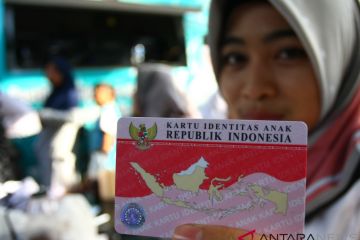 Petugas Disdukcapil Kota Tangerang Selatan menunjukan Kartu Identitas Anak (KIA) di sela-sela perekaman data pembuatan KIA di halaman kantor Kecamatan Pondok Aren, Tangerang Selatan, Banten, Jumat (16/11/2018). Pemerintah Kota Tangerang Selatan menargetkan sebelum tahun ajaran baru 2019/2020 semua anak warga Tangerang Selatan sudah memiliki KIA yang akan menjadi kelengkapan administrasi kependudukan dalam mengurus berbagai hal. ANTARA FOTO/Muhammad Iqbal/ama.