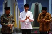 Presiden Joko Widodo (tengah) bersama Ketua Umum PP Muhammadiyah Haedar Nashir (kiri) dan Gubernur Jawa Timur Soekarwo bertepuk tangan seusai peletakan batu pertama pembangunan tower Universitas Muhammadiyah Lamongan (UML) di Sekolah Tinggi Ilmu Kesehatan (STIKES) Muhammadiyah Lamongan, Jawa Timur, Senin (19/11/2018). Dalam rangkaian kunjungannya, Presiden meresmikan Masjid Kampus Ki Bagus Hadikusumo, menyerahkan skep perubahan status enam perguruan tinggi Muhammadiyah serta peletakan batu pertama pembangunan tower Universitas Muhammadiyah Lamongan. ANTARA FOTO/Wahyu Putro A/foc.