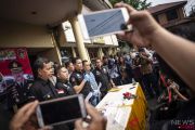 Kasat Reskrim Polres Metro Jakarta Barat AKBP Edy Suranta Sitepu (ketiga kiri) bersama jajarannya menunjukkan barang bukti dalam rilis perkembangan kasus penguasaan lahan yang melibatkan anggota kelompok Hercules di Polres Metro Jakarta Barat, Jumat (23/11/2018). Satreskrim Polres Metro Jakarta Barat menetapkan Handy Musawan sebagai tersangka karena terbukti memberikan surat kuasa penugasan kepada Hercules Rosario Marshal untuk menguasai dua lahan di kawasan Kalideres, Jakarta Barat pada Agustus 2018. ANTARA FOTO/Aprillio Akbar/wsj.