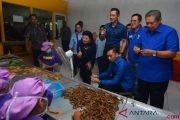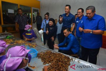 Ketua Umum Partai Demokrat Susilo Bambang Yudhoyono (kedua kanan) didampingi Ibu Ani Yudhoyono (kanan), Ketua Komando Satuan Tugas Bersama (Kogasma) Partai Demokrat Agus Harimurti Yudhoyono (kiri) dan Ketua Fraksi Demokrat Edhie Baskoro Yudhoyono (kedua kiri) menyaksikan produksi sale pisang saat ”Tour de Java" di Sukasenang, Kabupaten Ciamis, Jawa Barat, Senin (26/11/2018). Kunjungan tersebut dalam rangka persiapan pemenangan partai Demokrat untuk Pileg dan Pilpres 2019. ANTARA FOTO/Adeng Bustomi/aww.