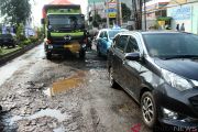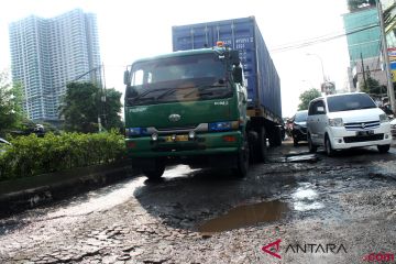 Pengendara truk memperlambat laju kendaraannya saat melintas jalan rusak di Jalan KH Noer Ali, Kalimalang, Bekasi, Jawa Barat, Selasa (27/11/2018). Dinas Perhubungan Kota Bekasi mengeluarkan kebijakan pelarangan dan pembatasan kendaraan truk berkapasitas di atas delapan ton melintas di jalur Kalimalang tersebut guna mengurai kemacetan dampak dari pembangunan Tol Layang Jakarta-Cikampek II. ANTARA FOTO/Risky Andrianto/ama.