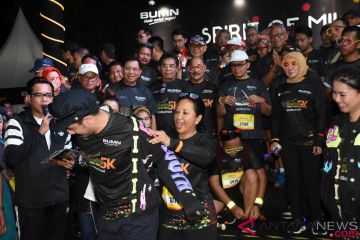 Menteri BUMN Rini M Soemarno (tengah) memakaikan jaket kepada perwakilan dari Millennials BNI Muhammad Ismeth (kiri) disaksikan jajaran direksi BUMN pada acara Glowing Night Run 5K di Parkir Timur Senayan, Gelora Bung Karno (GBK), Jakarta, Sabtu (1/12/2018). Ajang lari yang diselenggarakan BUMN tersebut diikuti sekitar 3.000 peserta dan nantinya uang pendaftaran dari para peserta akan disumbangkan seluruhnya untuk yayasan kanker, anak-anak terlantar, veteran, serta korban bencana alam. ANTARA FOTO/Indrianto Eko Suwarso/kye.