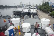 Personel Polairud beraktivitas di atas kapl KP Wibisana saat peresmian armada baru Polairud dalam peringatan HUT ke-68 Polairud di Makopolair Baharkam Mabes Polri, Tanjung Priok, Jakarta, Senin (3/12/2018). Kepolisian Air dan Udara (Polairud) Baharkam Polri meresmikan 23 armada baru yang terdiri dari kapal, pesawat serta helikopter yang diharapkan dapat menekan kejahatan di wilayah perbatasan Indonesia. ANTARA FOTO/Aprillio Akbar/kye.