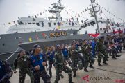 Personel Polairud dan TNI AL meneriakan yel-yel saat peresmian armada baru Polairud dalam peringatan HUT ke-68 Polairud di Makopolair Baharkam Mabes Polri, Tanjung Priok, Jakarta, Senin (3/12/2018). Kepolisian Air dan Udara (Polairud) Baharkam Polri meresmikan 23 armada baru yang terdiri dari kapal, pesawat serta helikopter yang diharapkan dapat menekan kejahatan di wilayah perbatasan Indonesia. ANTARA FOTO/Aprillio Akbar/kye.