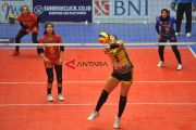 Pebola voli putri Jakarta PGN Popsivo melakukan selebrasi usai mengalahkan lawannya Bandung Bank BJB Pakuan dalam pertandingan bola voli seri kedua putaran pertama Proliga 2018 di GOR Tridharma Gresik, Jawa Timur, Jumat (14/12/2018). Jakarta PGN Popsivo Polwan menang atas Bandung Bank BJB Pakuan dengan skor 3-0 (25-14, 25-21, 25, 25-16). ANTARA FOTO/M Risyal Hidayat/aww.