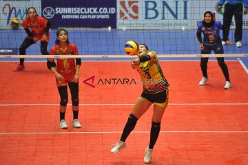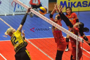 Pebola voli putri Jakarta PGN Popsivo Polwan Guedpard Pornpun (tengah) berusaha mengembalikan bola ke arah lawannya Bandung Bank BJB Pakuan dalam pertandingan bola voli seri kedua putaran pertama Proliga 2018 di GOR Tridharma Gresik, Jawa Timur, Jumat (14/12/2018). Jakarta PGN Popsivo Polwan menang atas Bandung Bank BJB Pakuan dengan skor 3-0 (25-14, 25-21, 25, 25-16). ANTARA FOTO/M Risyal Hidayat/aww.